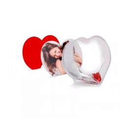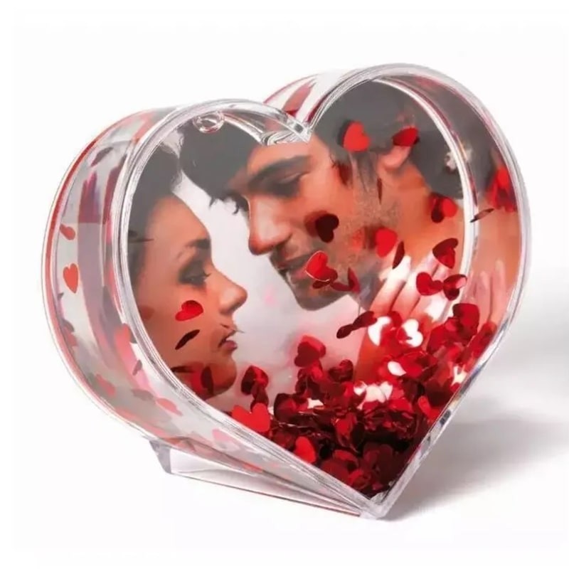Szív alakú fotógömb, személyre szabható egy fotóval, amelyet a földgömb hátulján keresztül szúrnak be. A földgömb belsejében piros szív alakú flitterek találhatók.